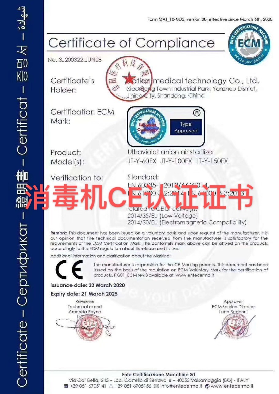 佳田醫療科技紫外線負離子消毒機現已取得CE認證證書,可出口歐盟國家,為抗擊全球疫情做出一份貢獻!